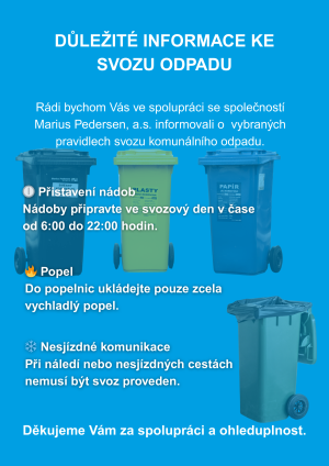 Dle informací společnosti Marius Pedersen a.s. sdělujeme, že komodita popela nebude v této topné sezoně 2025/ 2026 samostatně vyvážena. Domácnosti, kterým nebude stačit nádoba si buď koupí, případně doplatí rozdíl za větší nádobu. Další informace poskytneme na tel. č.702009478.