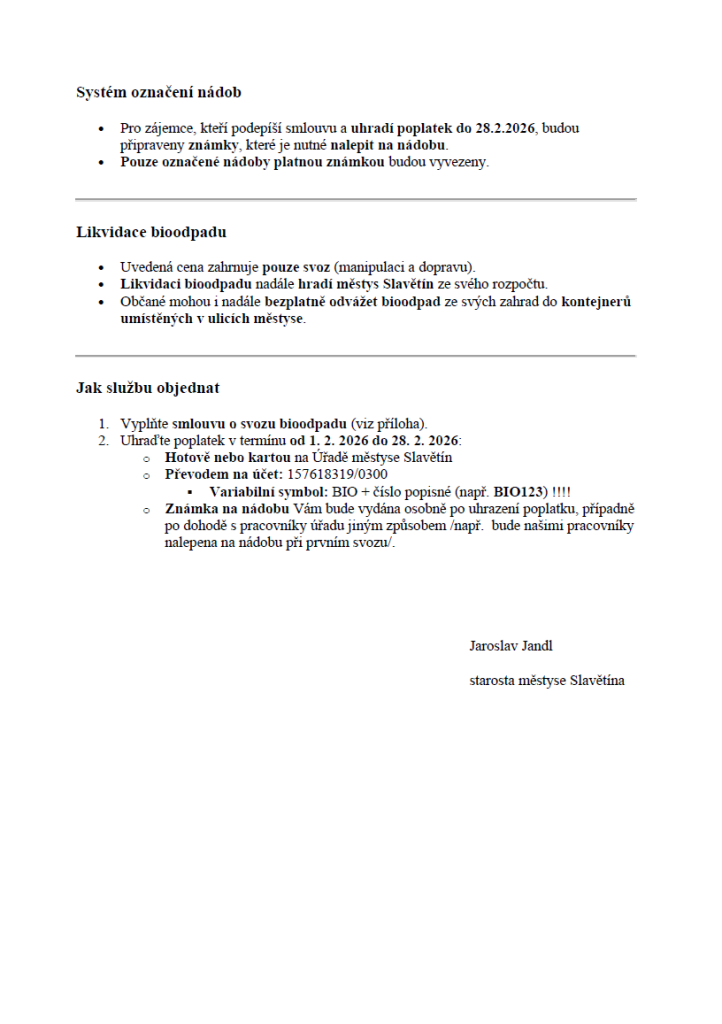 Městys Slavětín oznamuje, že smlouva na svoz a likvidaci biologicky rozložitelného odpadu je nyní k dispozici pro objednatele. Tento svoz probíhá od dubna do listopadu, s pravidelným svozovým dnem každé úterý. Objednatelé musí mít na popelnici vylepenou známku a dodržovat pokyny pro správné třídění odpadu. Cena za svoz v roce 2026 je stanovena na 500 Kč za nádobu o objemu 240 litrů. Veškeré další informace o specifikaci odpadu a podmínkách smlouvy jsou uvedeny v dokumentaci. Pro další dotazy se neváhejte obrátit na Městys Slavětín.