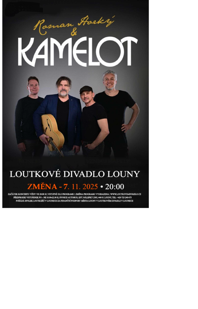 Pozvánka na koncert skupiny Kamelot a jejich skvělé písničky. Místo konání loutkové divadlo Louny